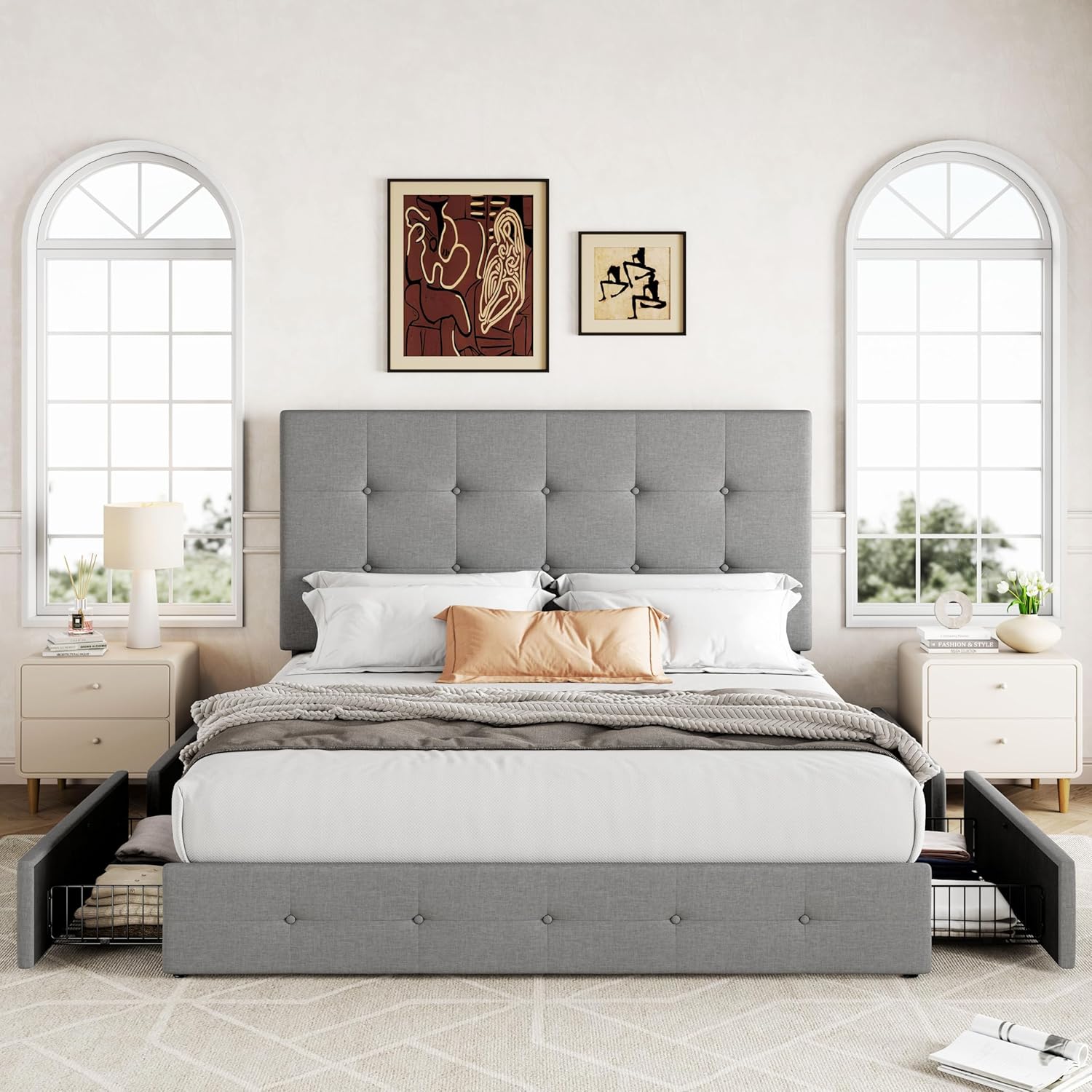 Allewie Upholstered Queen Size Platform Bed Frame with 4 Storage Drawers and Headboard, Square Stitched Button Tufted, Mattress Foundation with Wooden Slats Support, No Box Spring Needed, Light Grey