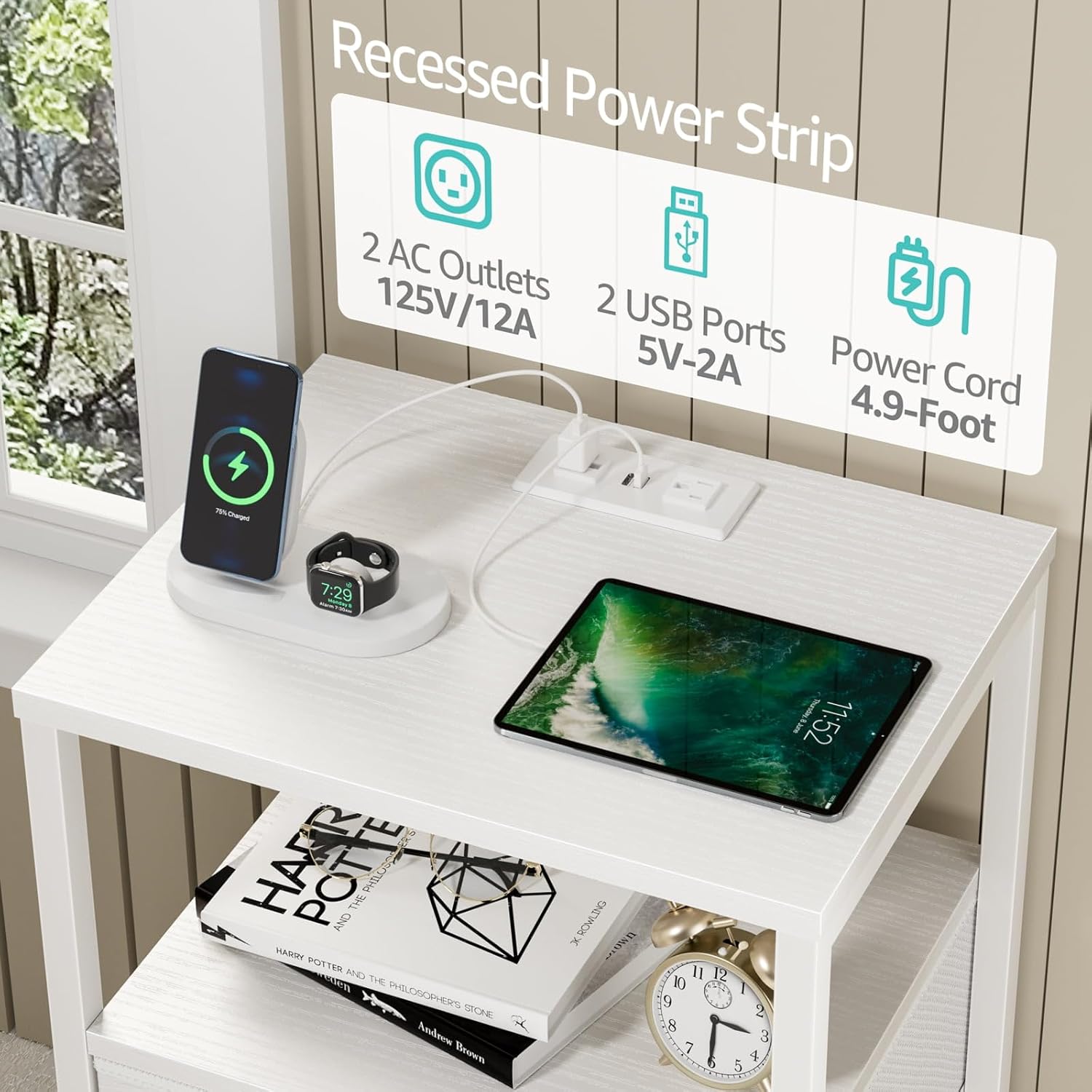 BOLUO White Nightstand with Charging Station, LED Night Stand with 2 Fabric Drawers, Bedside Table with USB Ports and Outlets, Nightstand for Bedroom Modern