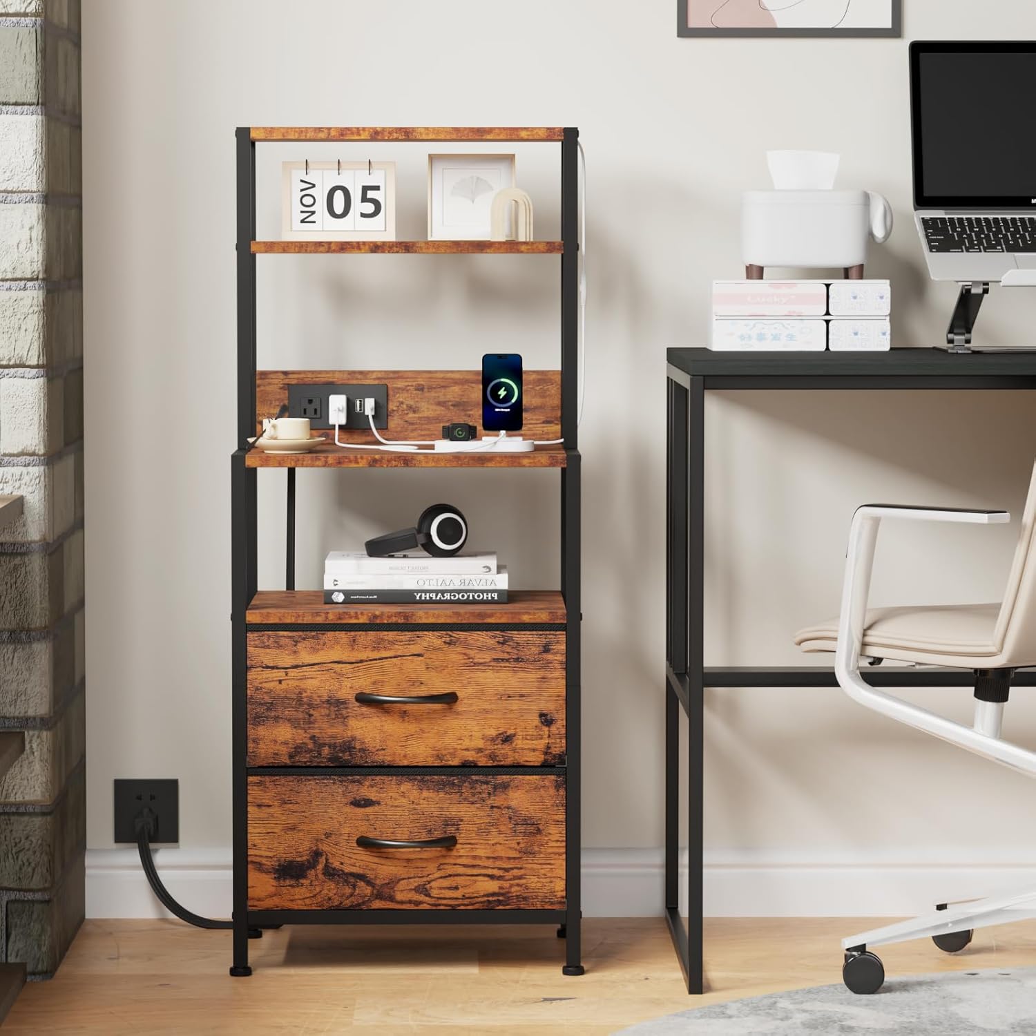 Furnulem Night Stand, Tall Nightstand with 4-Tier Shelves, 2 Fabric Drawers and Light Tube, Bed Side Tables with Charging Station, Bedside Table for Bedroom, Office, Rustic Brown