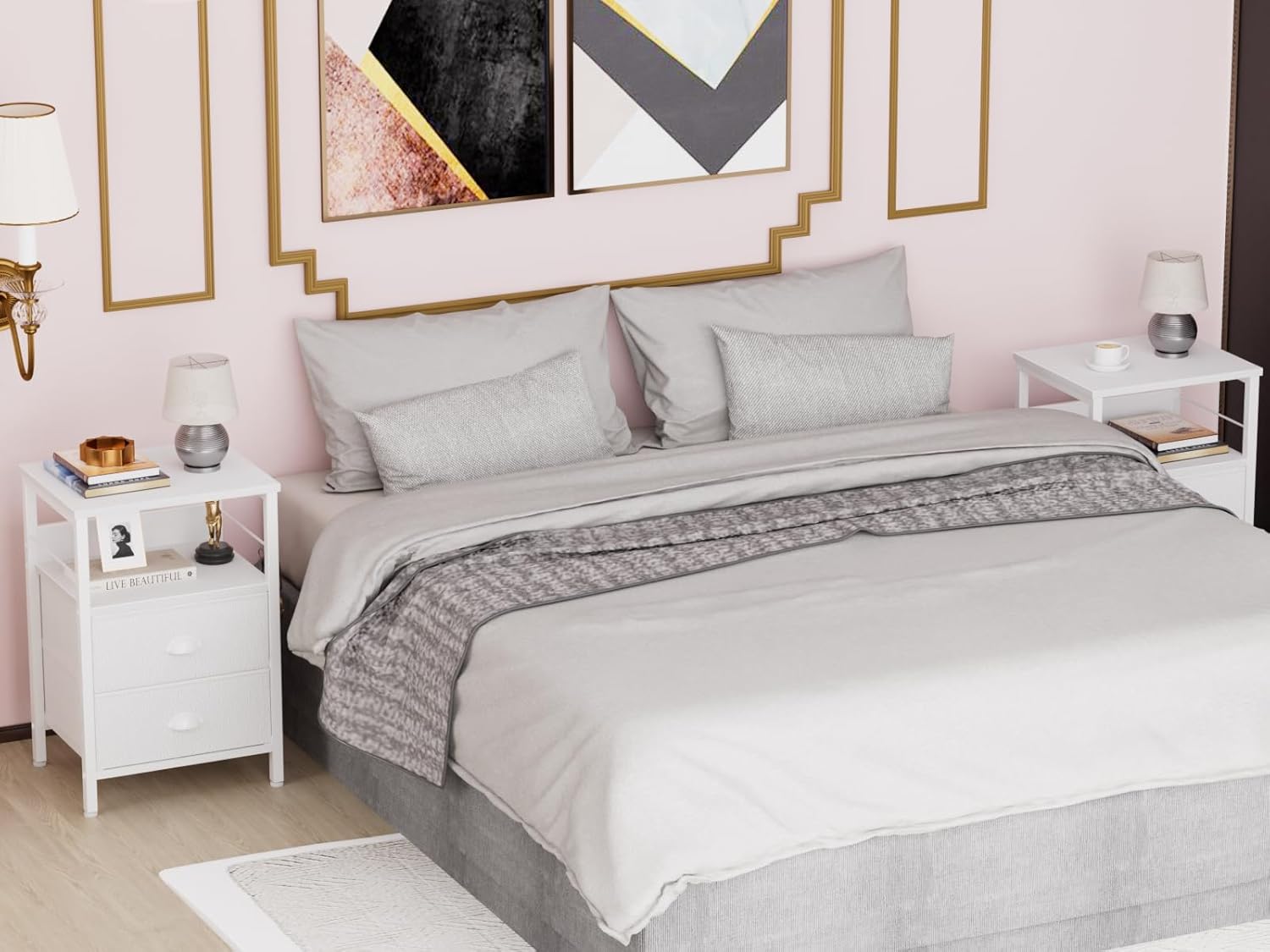Furologee Nightstands Set 2, End Table with 2 Fabric Drawers, Bedside Table with 2 Hooks, Open Wood Shelf Side Sofa Table for Bedroom/Living Room/Hallway/White