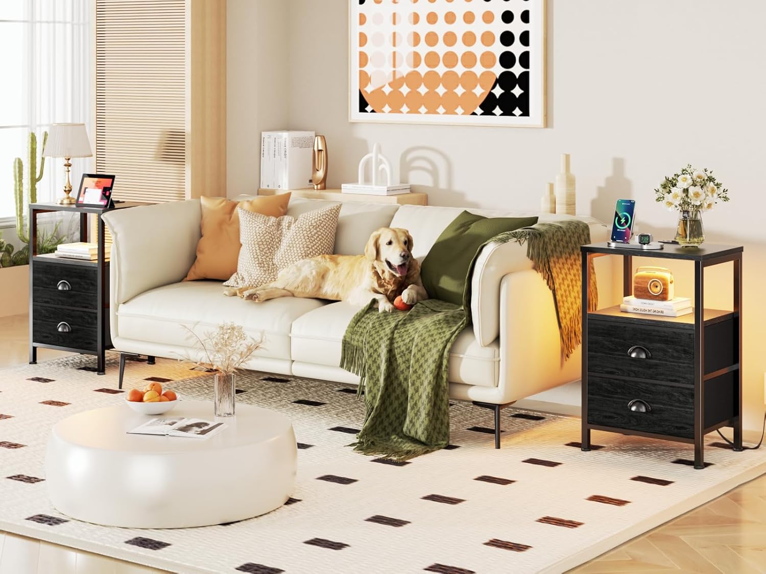 Furologee Nightstands Set of 2, End Tables with Charging Station and LED Lights, Black Night Stands with 2 Fabric Drawers, Bedside Tables Set of 2 for Living Room/Bedroom,Black Oak