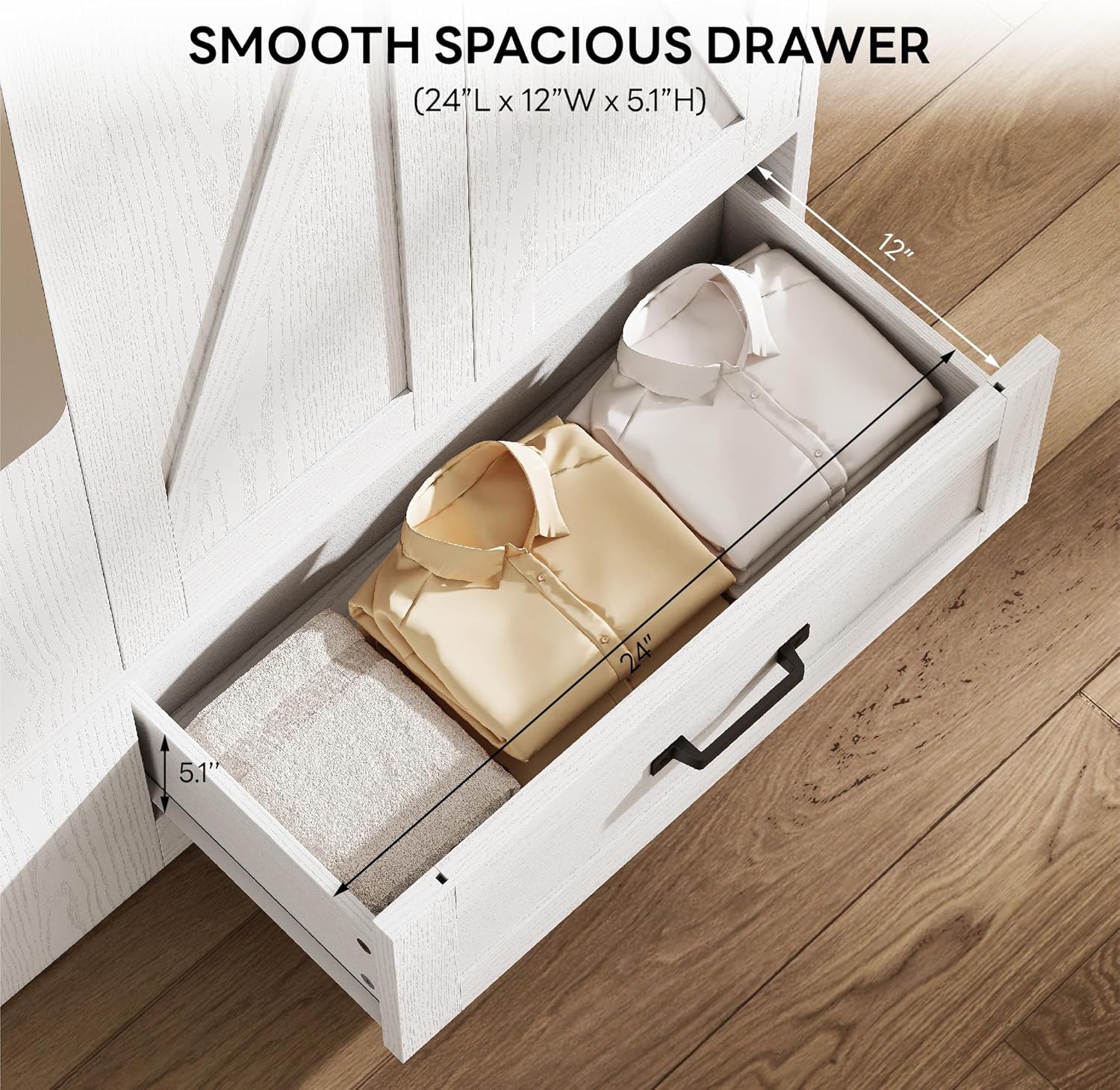 LIKIMIO Armoire Wardrobe Closet 70 Inches, Large Storage with Mirror, 2 Doors, Drawer, and Shelves, Modern Bedroom Freestanding Wooden Wardrobe Combination with Hanging Rail, White