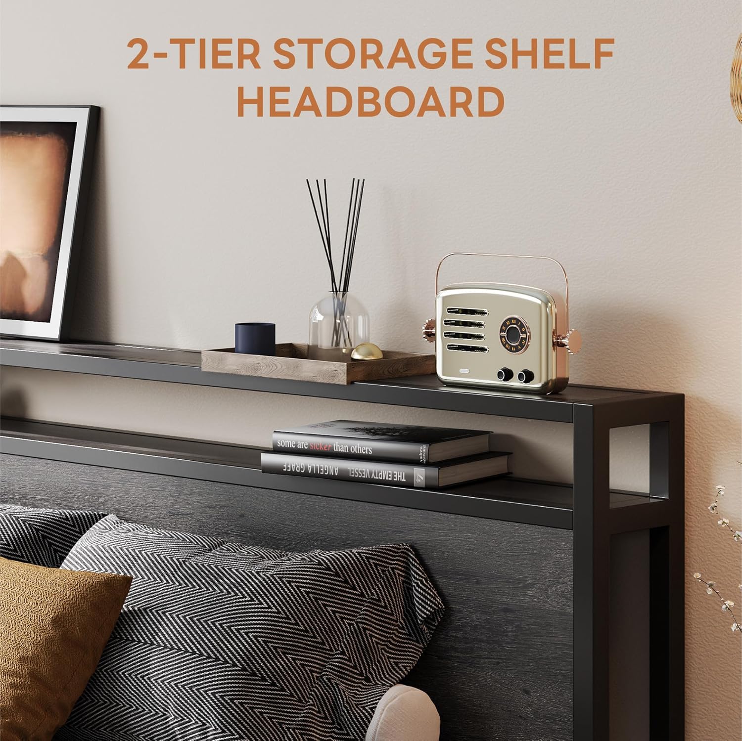 LIKIMIO Full Bed Frame with Headboard, Dark Wood Camas Full with Strong Supports, Sturdy, Noise-Free, No Box Spring Needed, Charcoal Grey