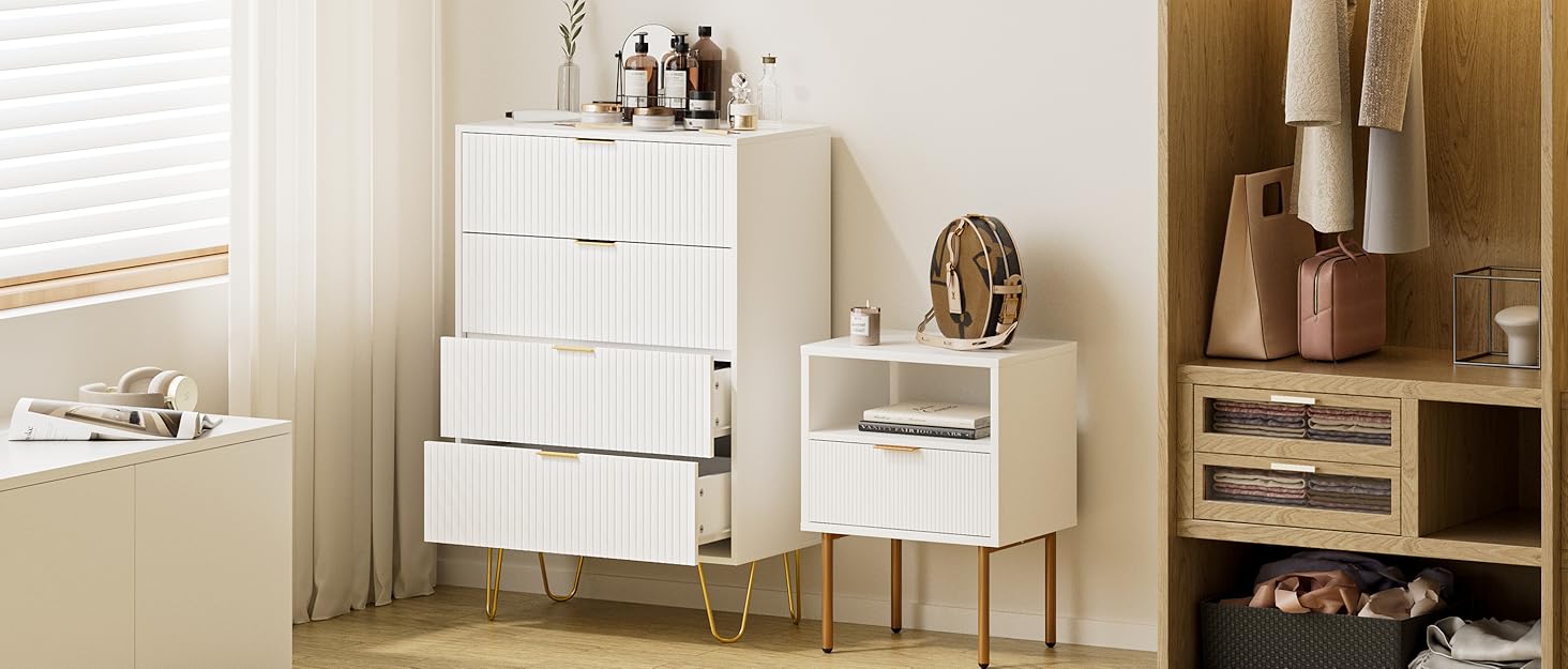 This nightstand stands out with its unique design and stylish appearance. The combination of wood grain drawer fronts and gold metal legs fuses fashion and modern decor aesthetics, adding a distinctive charm.