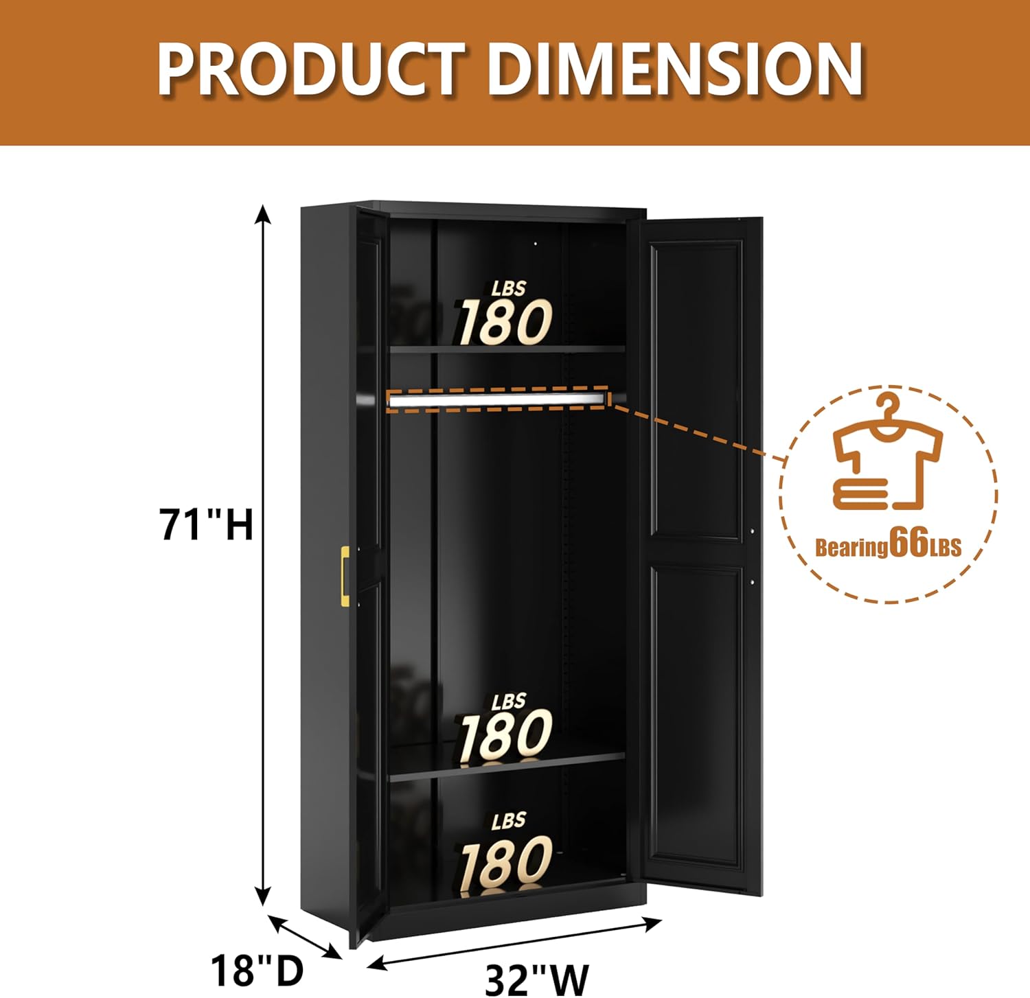 Metal Armoire Wardrobe Closet with Hanging Rod, 71" Tall Wardrobe Cabinet for Clothes, Black Clothing Storage Cabinet with Doors and Shelves, Large Wardrobes for Bedroom-Assemble Required