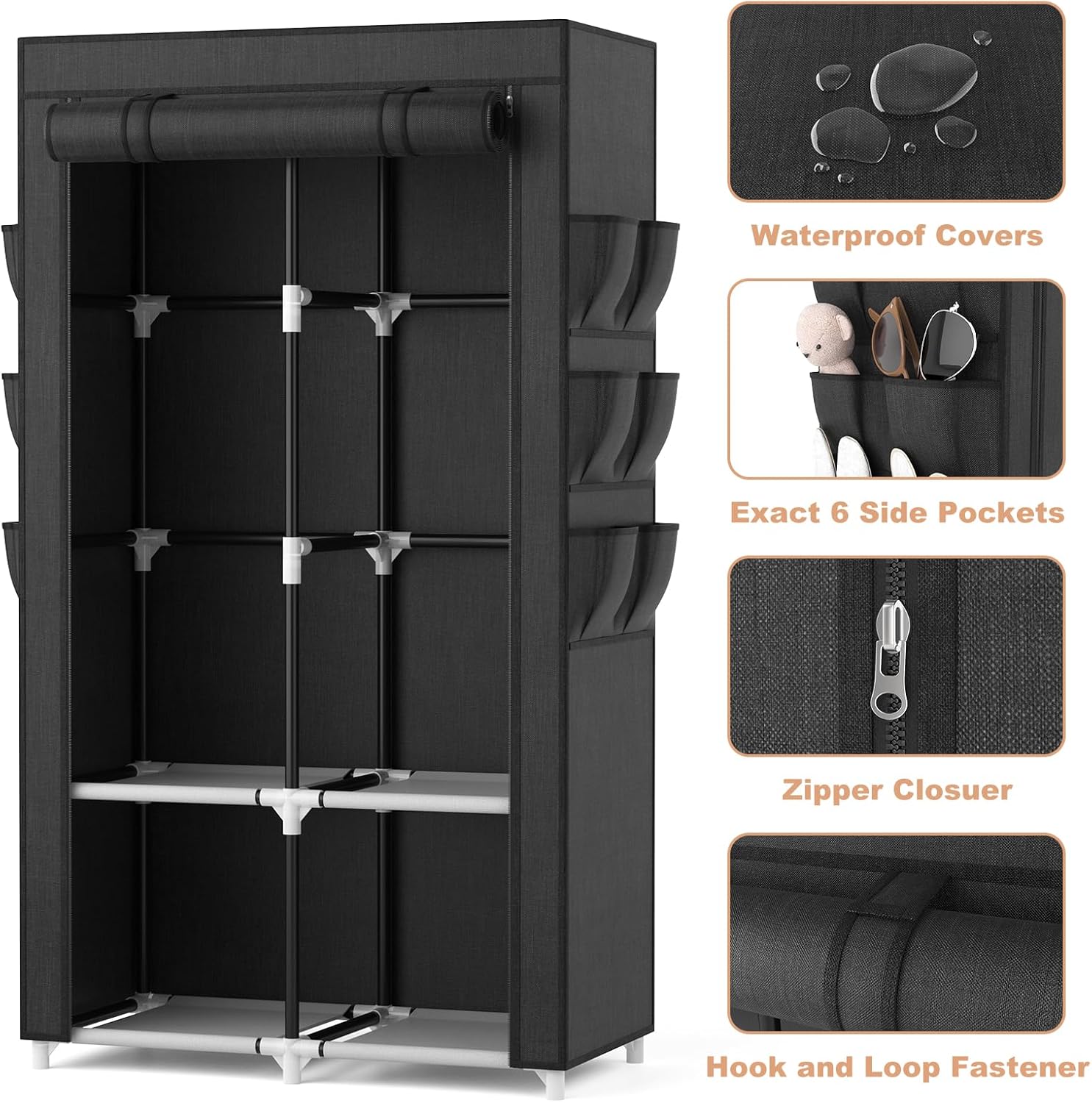 VTRIN Portable Closet Wardrobe Closet for Hanging Clothes with 4 Storage Shelves, 2 Hanging Rods and 6 Pockets, Stable and Easy Assembly Clothes Rack with Cover Free Standing Closet for Bedroom, Black