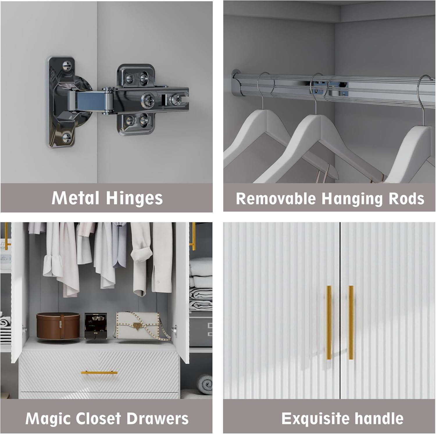 Wooden Armoire Wardrobe Closet:Large Wardrobe Closet with 4 Doors, 3 Drawers for Tall Cabinet, Wardrobe Cabinet for Bedroom with Hanging Rods, Golden Handle, White